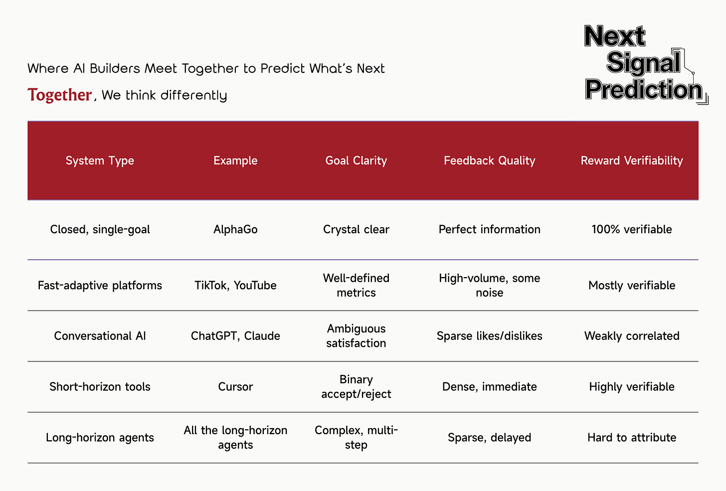 Dense rewards work: When feedback is immediate and unambiguous (code works/doesn’t work, user accepts/rejects), learning accelerates. Contrast this with chatbots where “was this helpful?” barely correlates with actual utility.