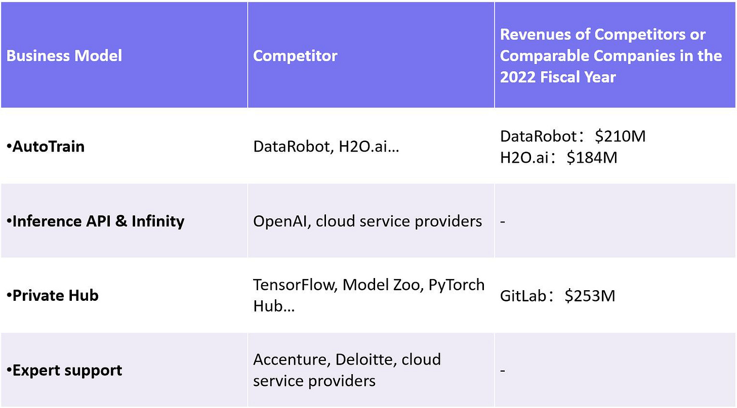 The business model of Hugging Face suggests that its current market direction is AutoML + Private Hub + Large Language Model. Hugging Face might expand its business into MLOps. If it can make it, Hugging Face will grow to be a giant in the AI/ML sector. Even if not all its attempts succeed, each pathway still offers a huge market of their own.