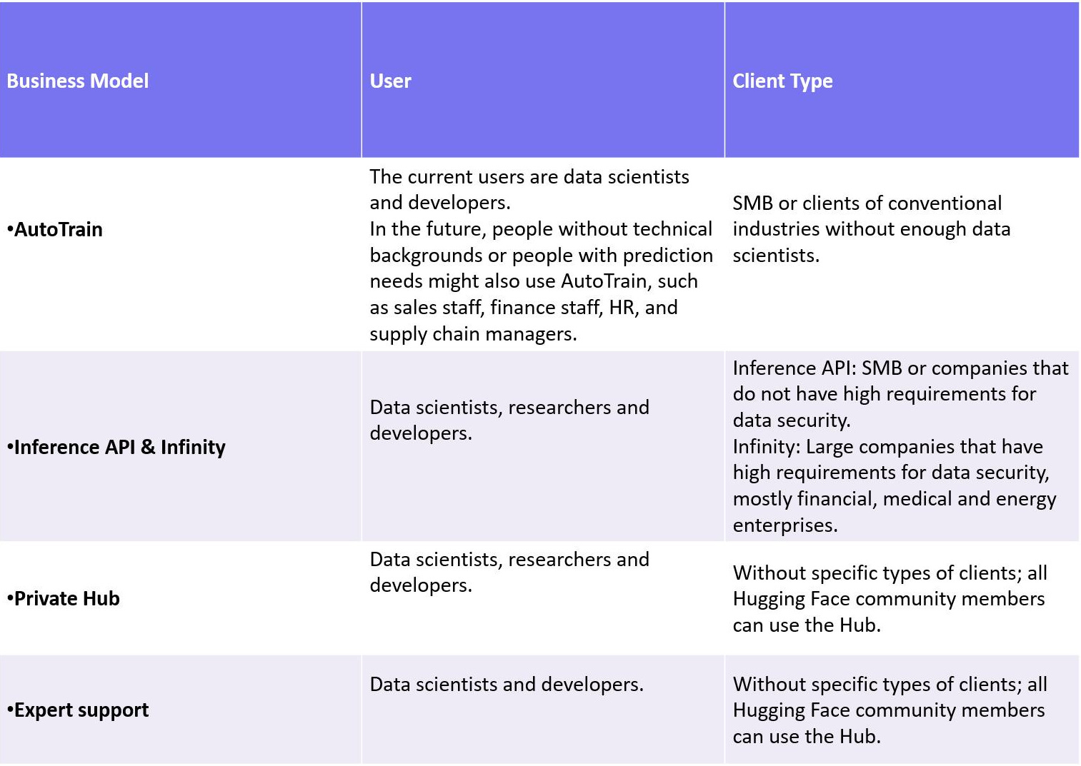 Since large enterprises, especially financial, energy and medical companies, cannot keep their data and models on third-party servers for safety and compliance concerns, Inference API is not there to help. As a result, Hugging Face developed another inference product for these clients, which was later known as Infinity. Infinity allows clients to deploy data and models on their own on-prem servers. Now some clients have already put Infinity into application. Big financial companies like JP Morgan are the potential clients of Infinity.