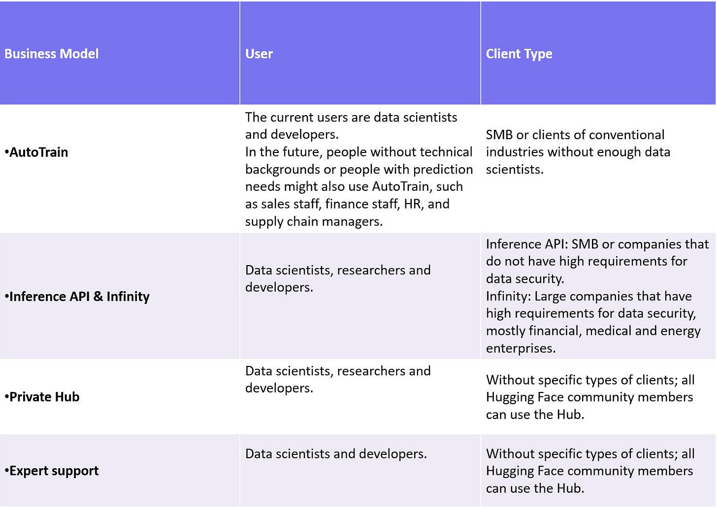 Hugging Face offers two paid inference products: Inference API and Infinity. Hugging Face launched Inference API first, which requires users to deploy data and models on Hugging Face's servers. The upside is that teams without internal infrastructure or without data scientists can still leverage ML solutions. Therefore, the target users are often SMB.